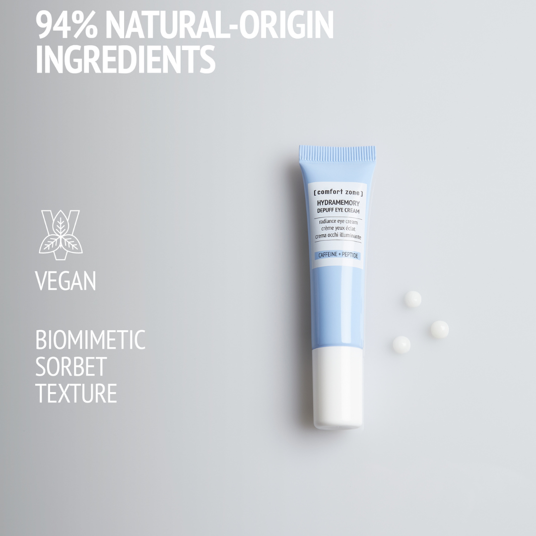 Hydramemory Depuff Eye Cream is a depuffing and hydrating eye contour cream formulated with caffeine and a specific peptide for the eye (ACETYL TETRAPEPTIDE-5) in a biomimetic texture for a well-rested look. Clean, vegan, and naturally derived formula is clinically proven to improve the looks of dark circles, eye bags and fine dehydration lines. Results? The eye area is left brighter, smoother and more hydrated.