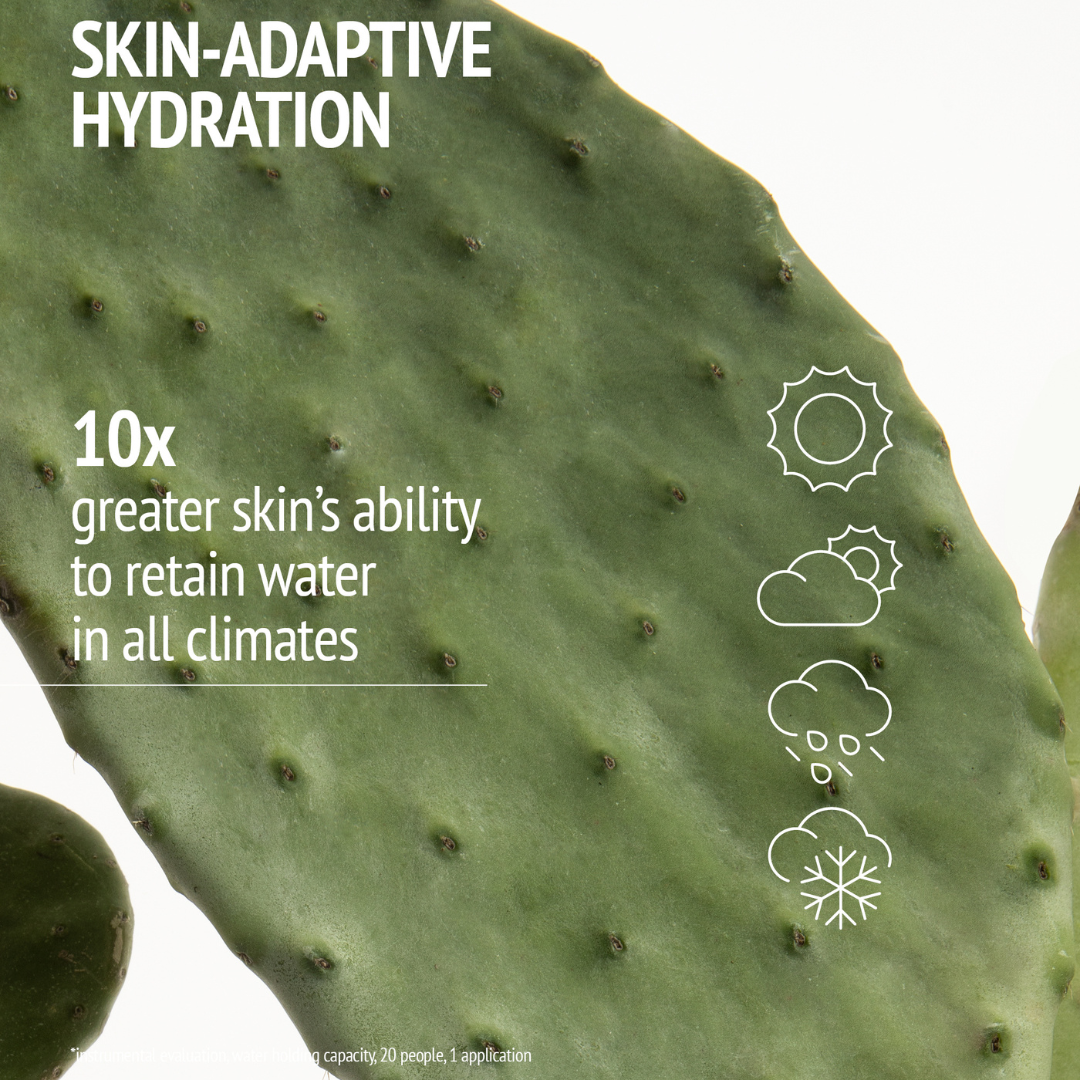 The clean, vegan, and naturally derived formula is enriched with patented SKIN-ADAPTIVE™ HYDRATION technology: Prickly Pear Extract from regenerative organic agriculture and Macro Hyaluronic Acid*, combined with biomimetic sorbet texture, give comfort and intense hydration to the skin, making it ideal for treating dry, tight, or dull skin.
